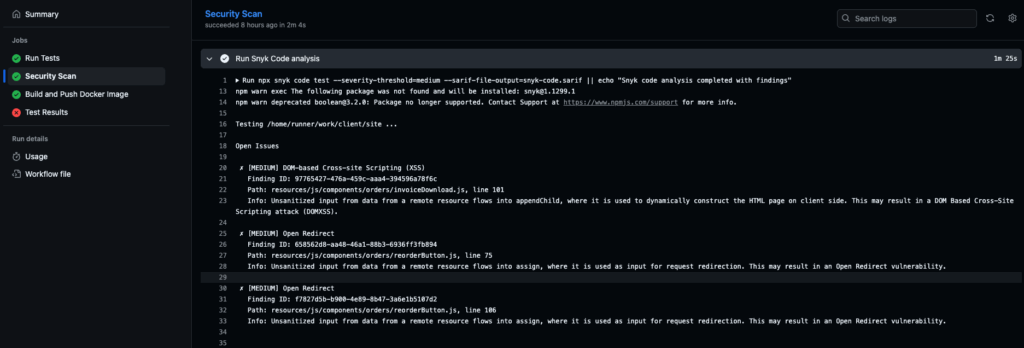 Once that code reaches the CI/CD pipeline, the system that tests and deploys everything, Snyk runs again as part of the automated build process. This ensures that no code, dependency, or last-minute tweak is introduced into production without a thorough security check.